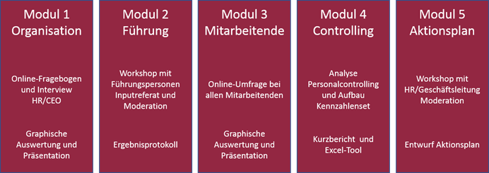 Modul 1 Organisation | Wir analysieren Strategie, Struktur, Kultur und die HR-Prozesse Ihrer Organisation daraufhin, wie gut sie die Vereinbarkeit von Beruf und den weiteren Lebensinhalten sowie die Gleichstellung von Frau und Mann fördern. Wir zeigen Stärken und Potentiale auf. |
